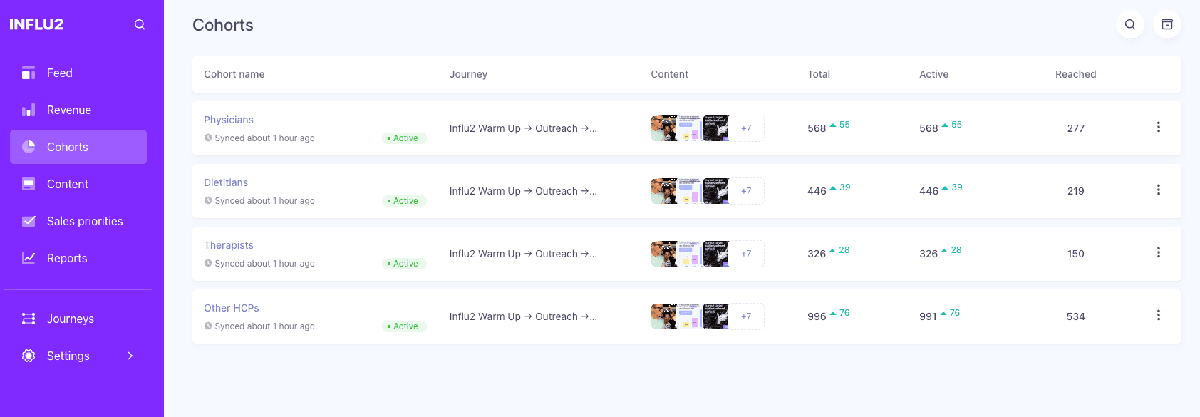 Once this is set up, you’ll have access to a dashboard, showing you how many people are in each cohort at the moment, how many people you’ve reached, and which content is going out to them.