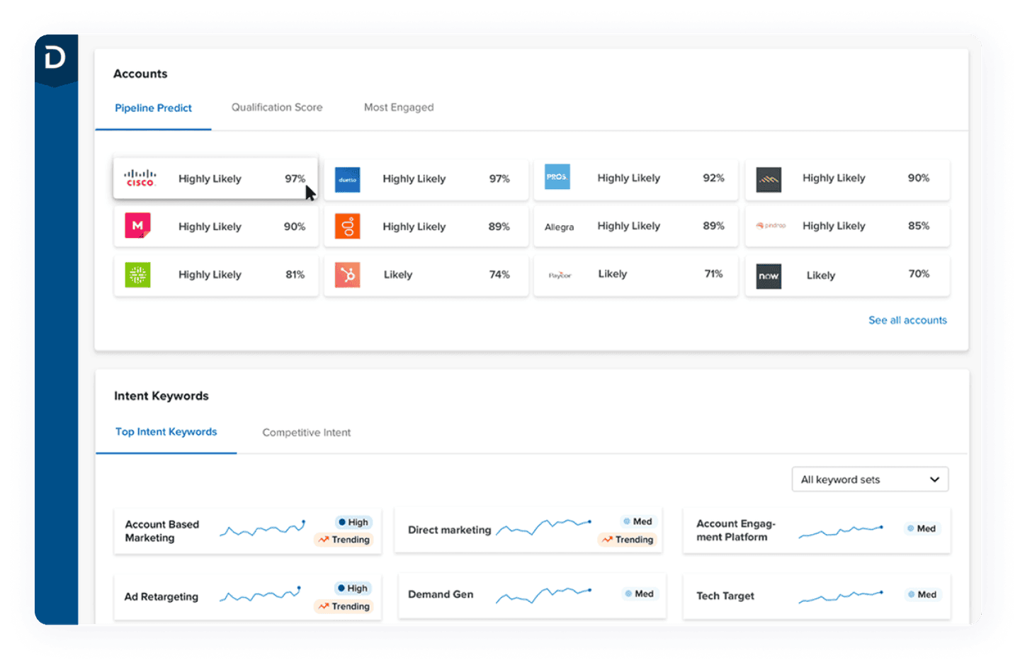 Bottom line: Ultimately, 6sense is for teams who need a robust, one-stop-shop ABM platform to help them identify target accounts. Teams without the budget and capacity to properly implement 6sense might find it difficult to drive adoption and realize the platform’s potential ROI.