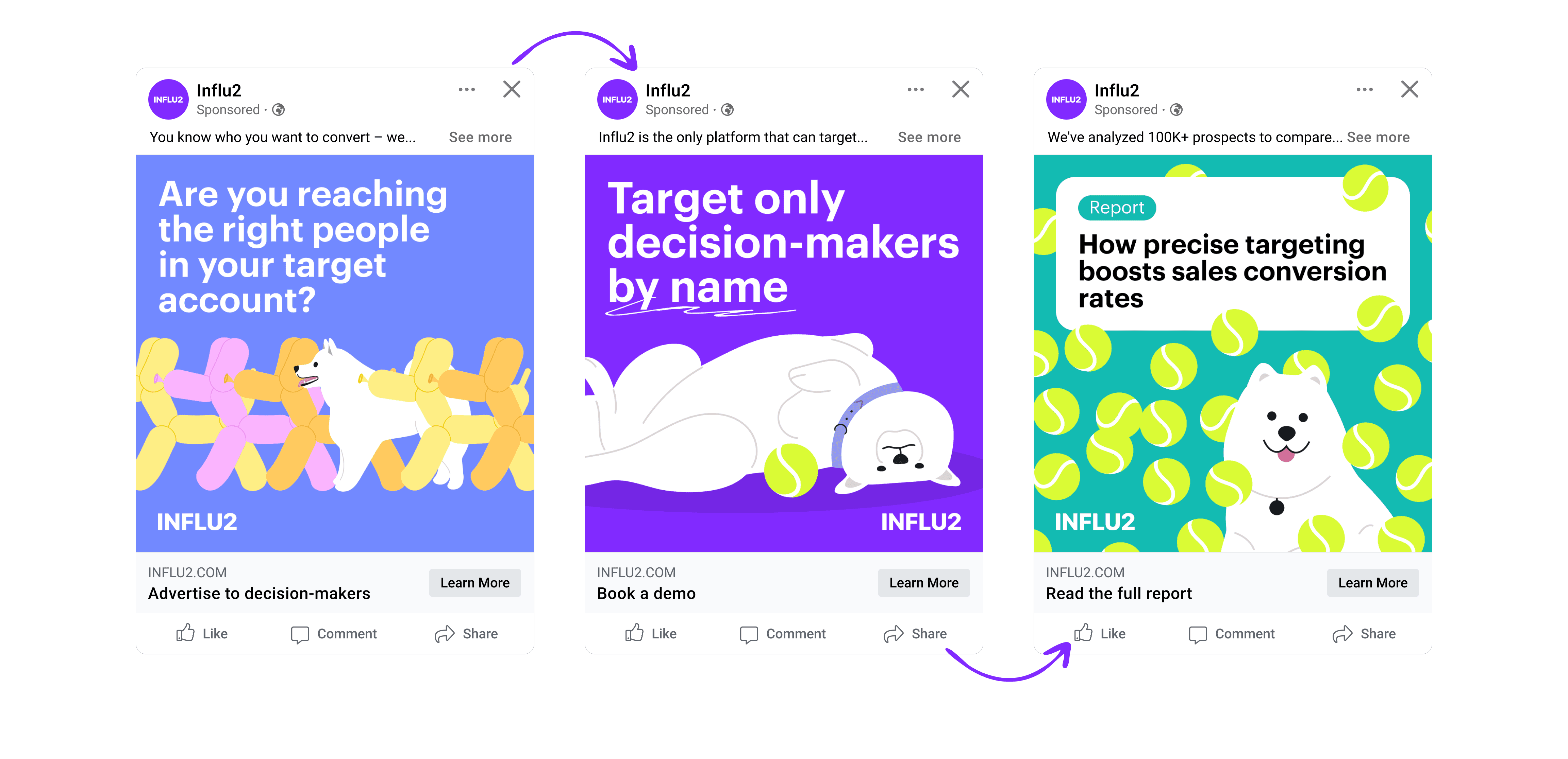 The traditional ABM platforms allow you to move entire accounts through the journey. But if the goal is to provide a personalized ad experience to each buyer, this approach simply won’t do. As a contact-level ABM engine, Influ2 shows ads to specific people. This means that you can create custom journeys for different groups and automate ads swap for each person.