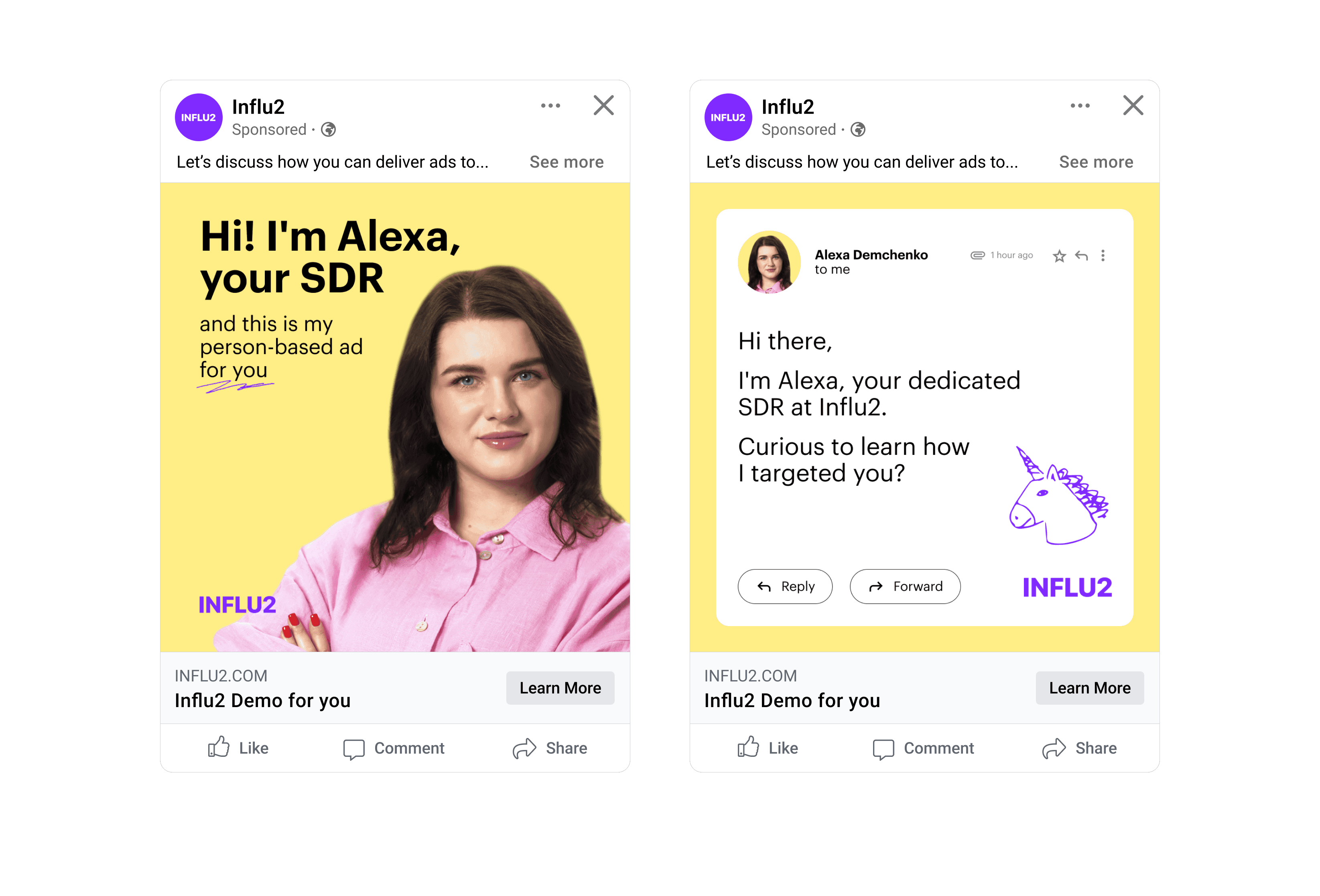 2. Data points from your CRM. Influ2 integrates seamlessly with your sales tools to gather additional context. The platform gathers info about email correspondence, CRM scores, new opportunities and their stages, won and lost deals, as well as other sales data points. This provides a deeper understanding of the target audience's specific needs and interactions with your sales team. For instance, an SDR has been sending outreach emails to a target. During this time, marketers can support sales prospecting by running ads with a personalized introduction of this SDR. It’s a great way to help sales build personal connections through other channels. Once a prospect agrees to a call, the ad content should evolve to the next stage – e.g. demo invites, case studies from similar industries, etc.