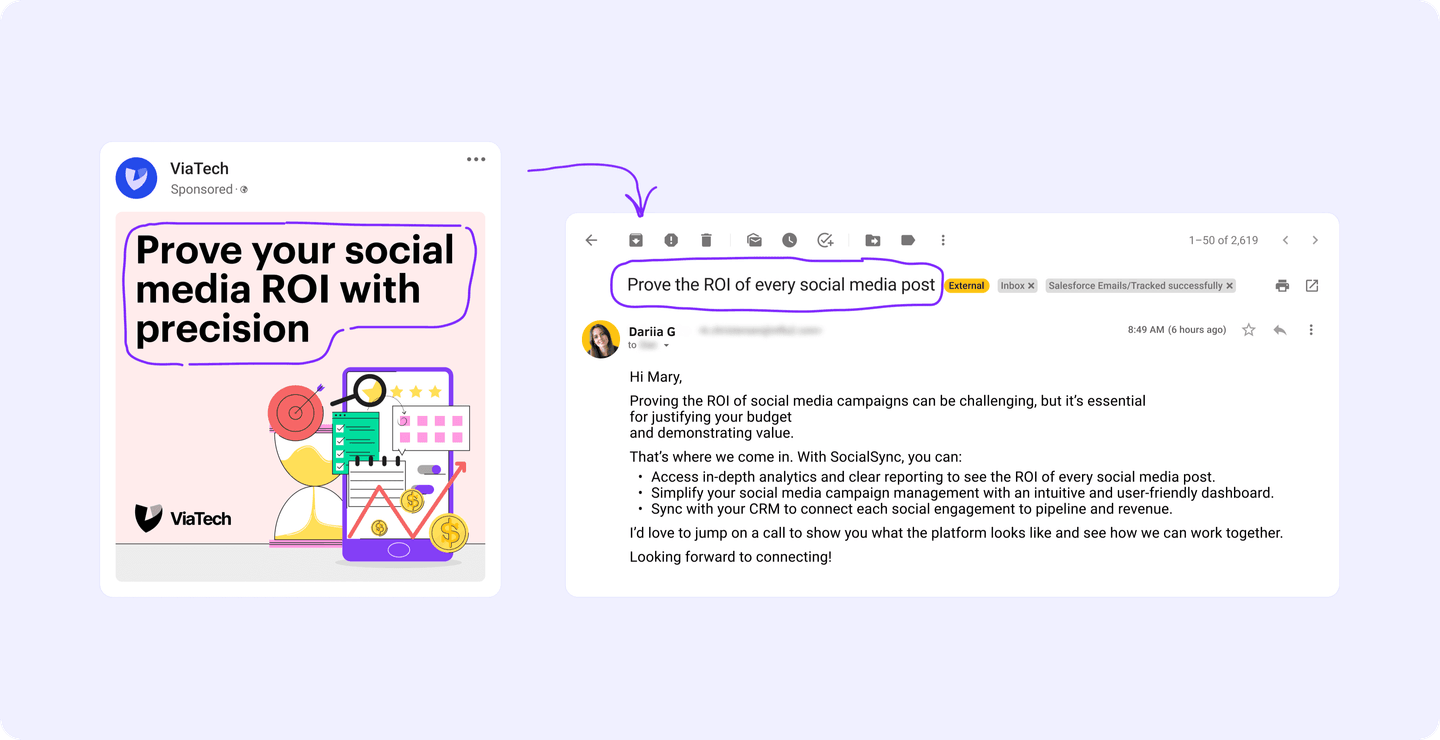 We also recently released a new feature in Influ2 that auto-filters social activity to capture meaningful social signals, so Marketing and Sales can act on them quickly. Trying that out, I’ve found that strong signals aren’t limited to ads—they can come from anywhere, and you need to be ready to adapt your outreach to the source.
