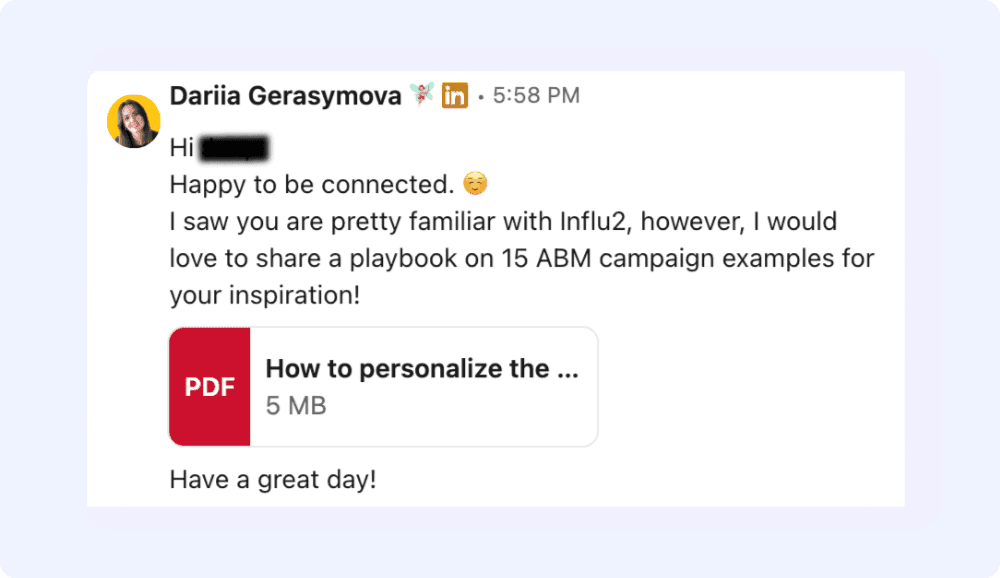 Hi there! I’m Dariia, a marketer-turned-SDR. I spend my days at Influ2, using contact-level ABM to develop creative and compelling outbound outreach.