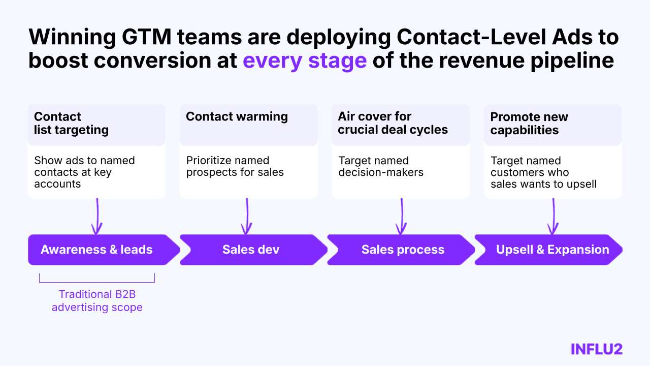 For Influ2, our enemy was a mindset that confined ads to the lead generation phase. We’re advocating for something bigger – that ads could and should play a role at every stage of the buyer’s journey, from pipeline generation to closing the deal and even into post-sale expansion.