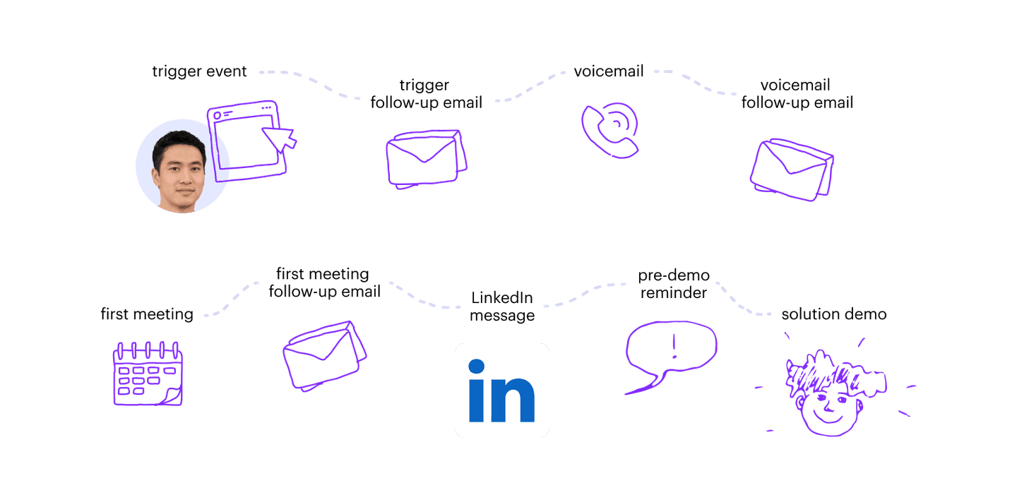For contacts with Influ2 ad impressions only, automated Salesloft sequences are used. For Influ2-engaged contacts who click ads, SDRs use Salesloft to tailor their sales sequences to the content they engaged with in the ad campaign, ensuring timely follow-up with relevant messaging.