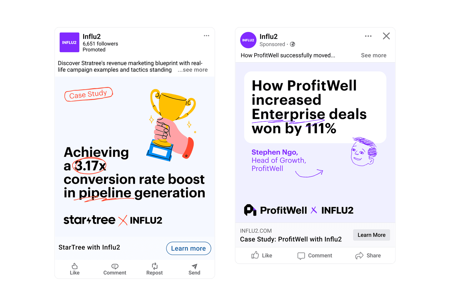Ads should suit the specific stages of the sales cycle. At the beginning, it’s better to showcase thought leadership content, use cases, and case studies. As the cycle progresses, you can highlight content that helps build credibility or address potential deal blockers.