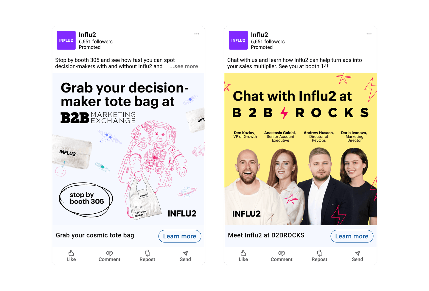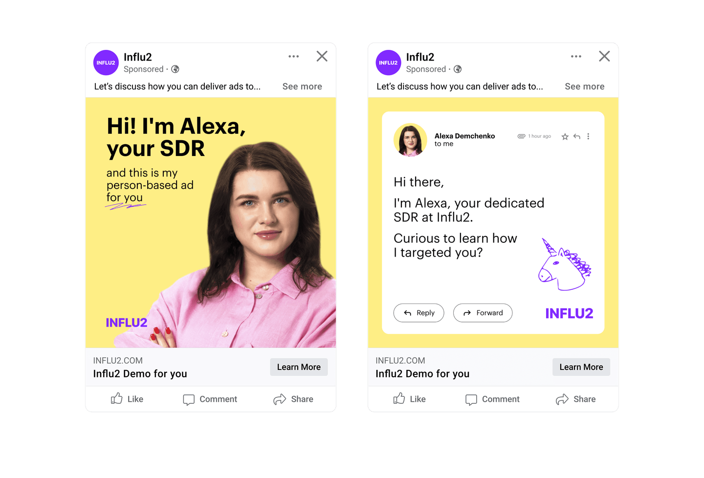 2. Data points from your CRM. Influ2 integrates seamlessly with your sales tools to gather additional context. The platform gathers info about email correspondence, CRM scores, new opportunities and their stages, won and lost deals, as well as other sales data points. This provides a deeper understanding of the target audience's specific needs and interactions with your sales team. For instance, an SDR has been sending outreach emails to a target. During this time, marketers can support sales prospecting by running ads with a personalized introduction of this SDR. It’s a great way to help sales build personal connections through other channels. Once a prospect agrees to a call, the ad content should evolve to the next stage – e.g. demo invites, case studies from similar industries, etc.