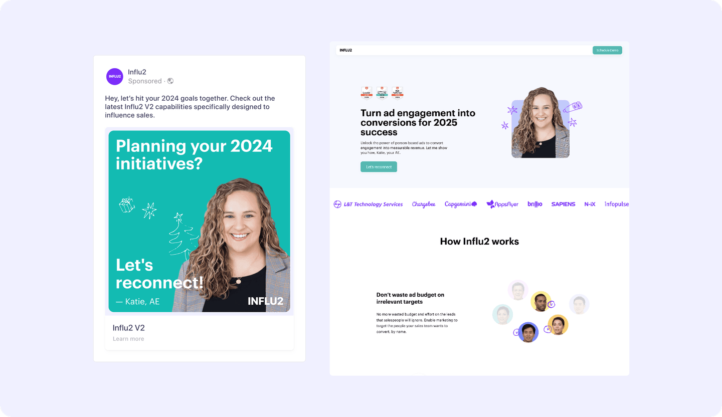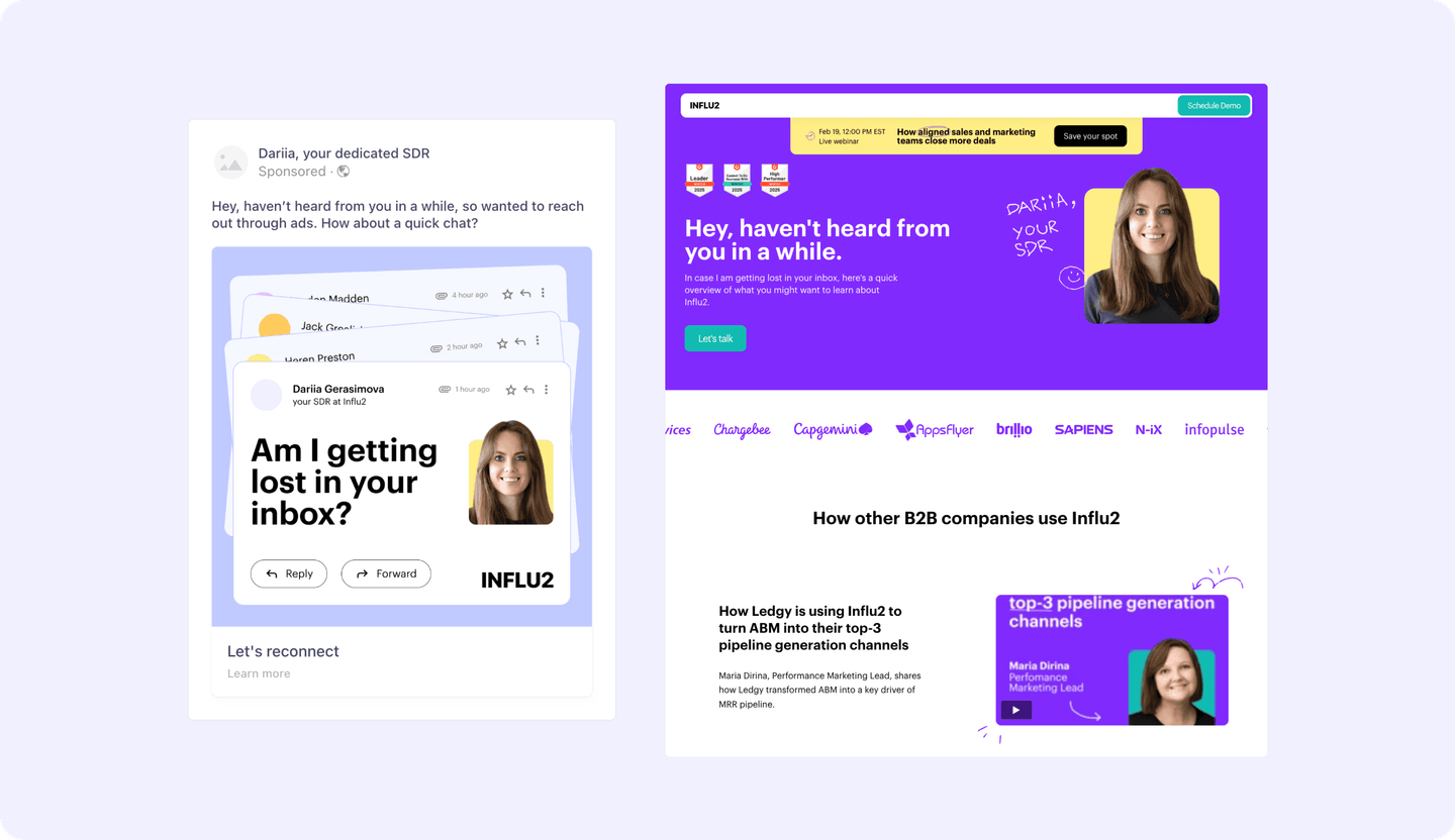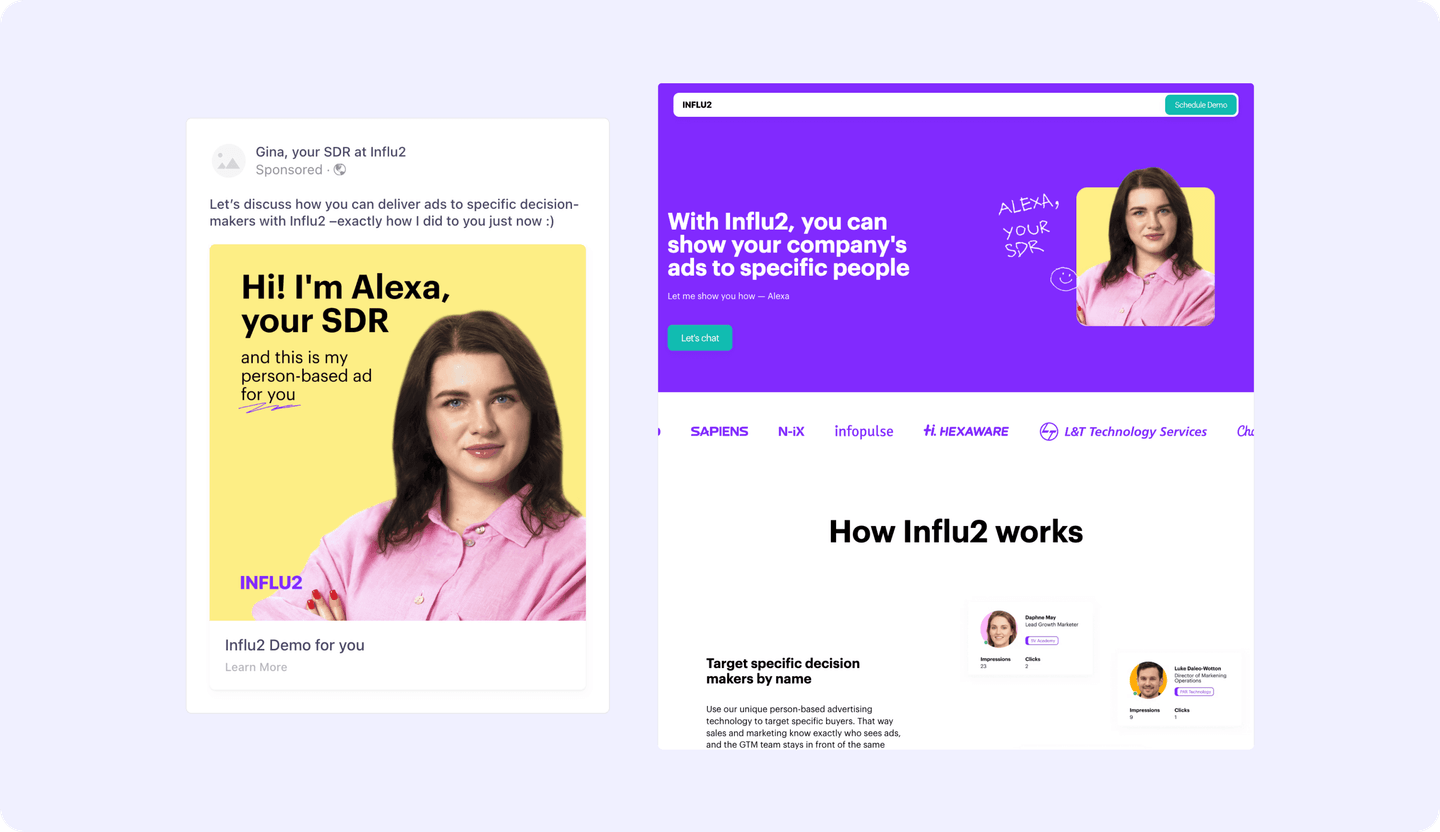 At Influ2, we do this primarily through contact-level advertising, designing ad journeys that adapt based on prospect engagement and that align with the SDR outreach process.