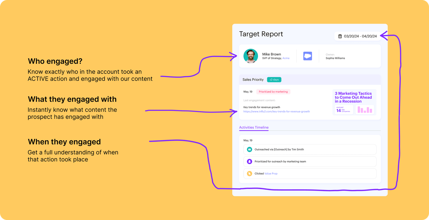Before reaching out, SDRs can see what ads that prospect has seen and which ones they’ve clicked on, then use this intent signal to tailor their pitch to the pain point that prospect identifies most with.