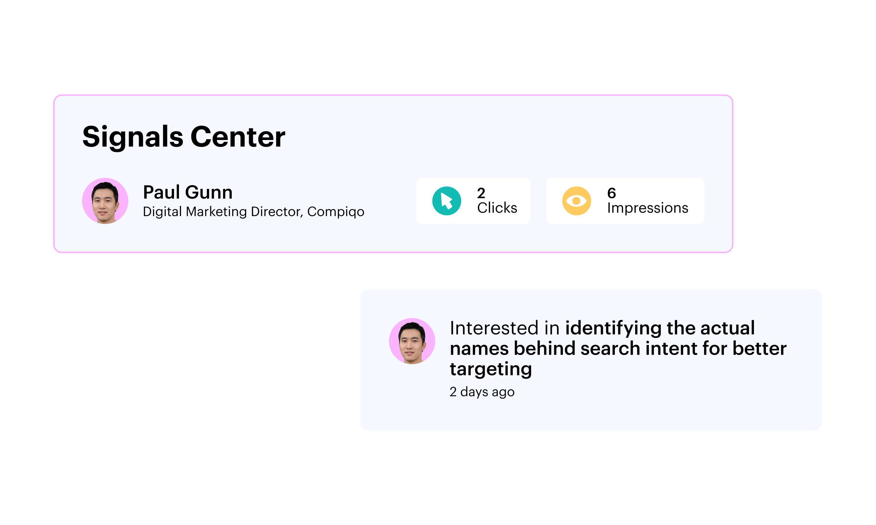 Buyer signals fall flat if they’re not acted on quickly. Signals Center combines real-time buyer signals with the meaning behind them—so Sales knows exactly who to contact and what to say to capture interest.