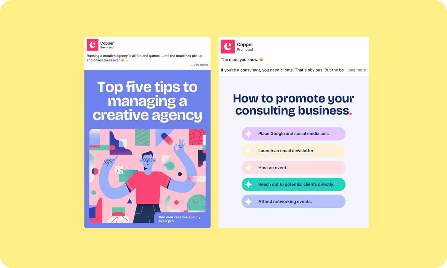 Here’s a real-world example from Copper: they sell to different audiences, including creative agencies and consultants. So, they created targeted ads with content that appeals to those different audiences.