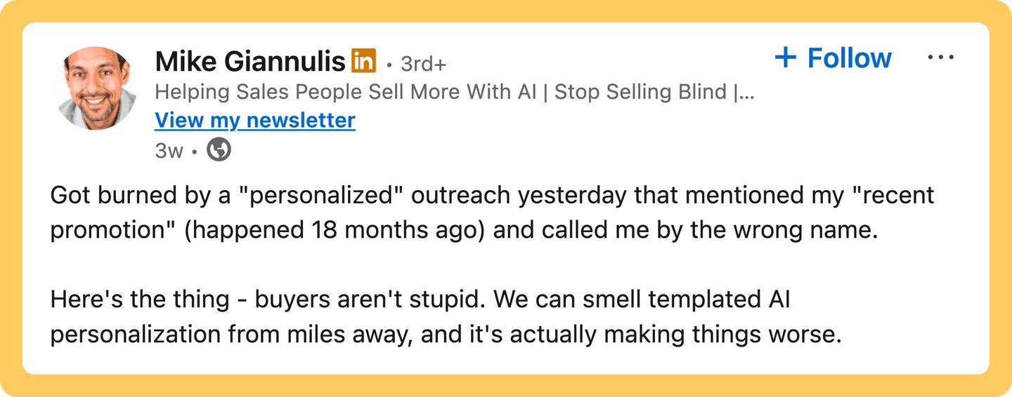 When you personalize your messaging based on aggregated account data or scraped data from a database, it creates the illusion of personalization, but not the experience of it.