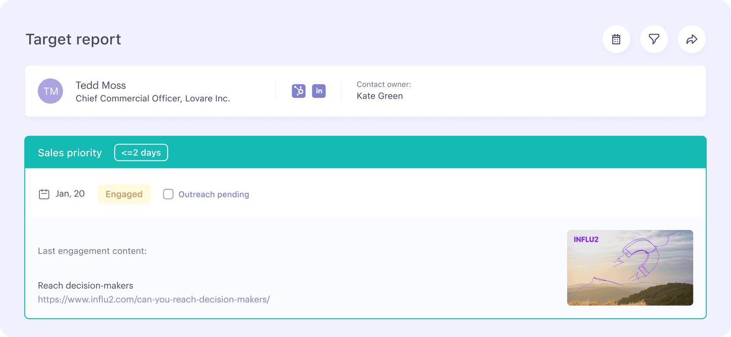 By combining Bombora’s account-level intent data with Influ2’s contact-level intent, you get the best of both worlds: the right accounts on your radar, and the right people inside those accounts in your sights.