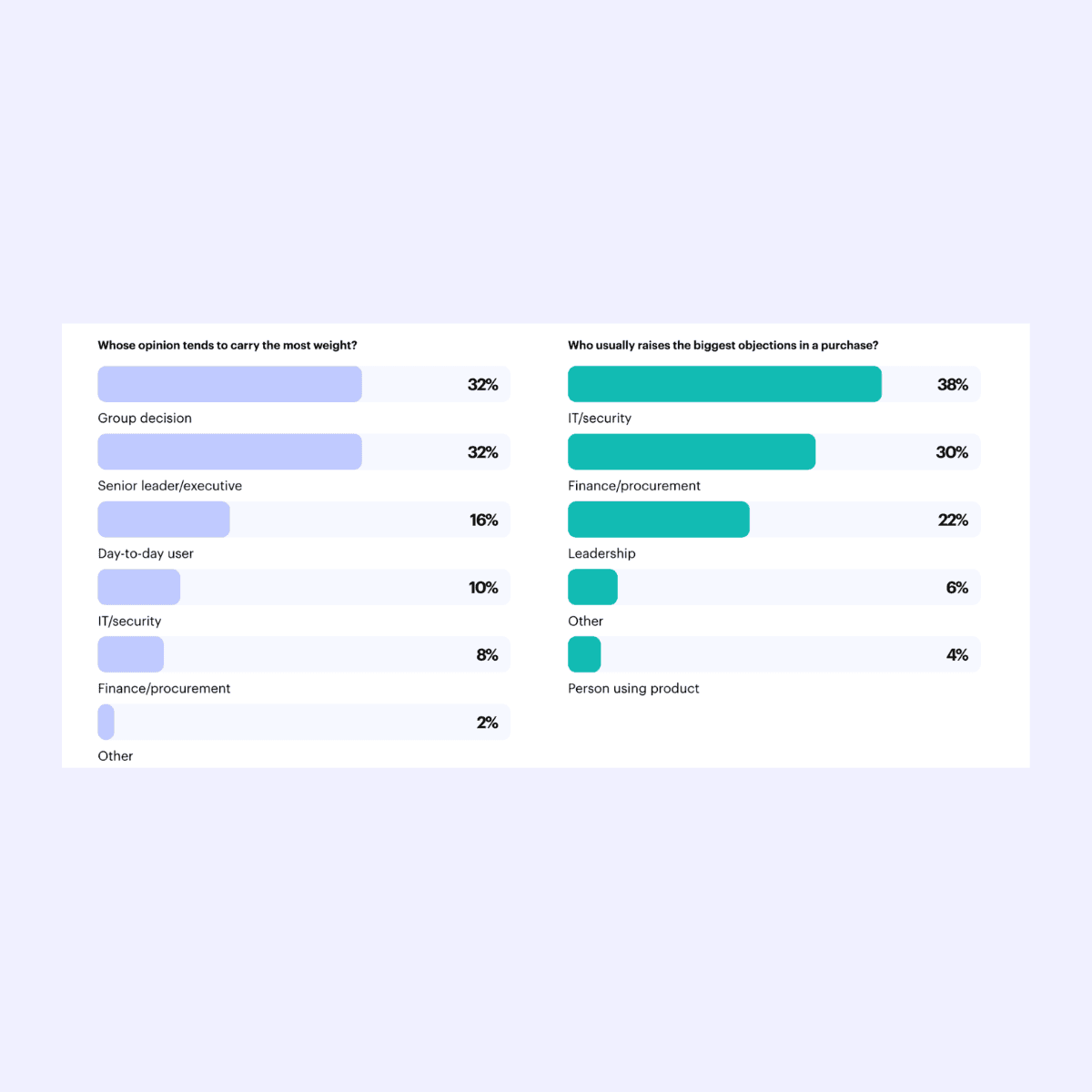 In many B2B deals, senior leaders are at the front of the buying decision, but IT, security, and finance are also involved, often blocking the deal with practical objections.