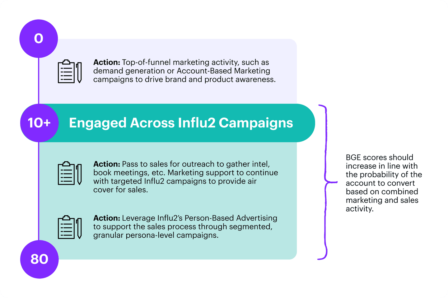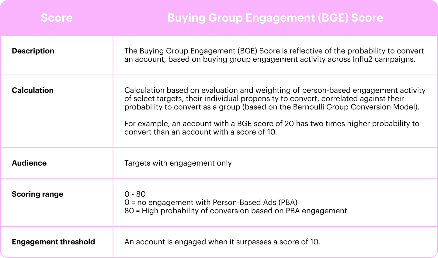 The BGE score indicates when key decision-makers and buying groups in your target accounts across your Influ2 campaigns are ready to be engaged by sales and marketing.