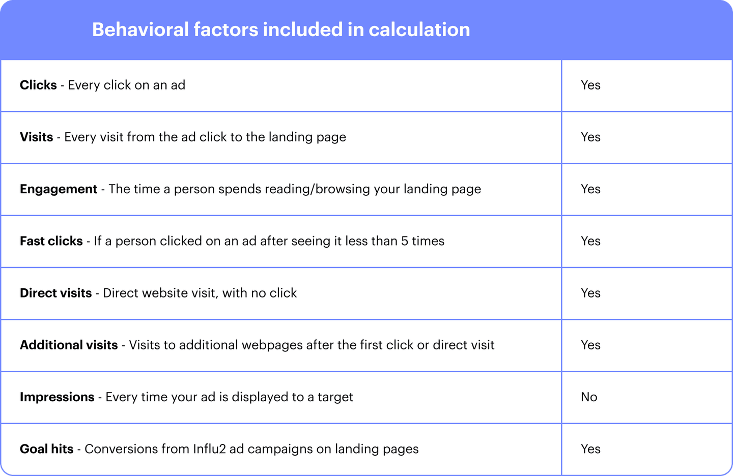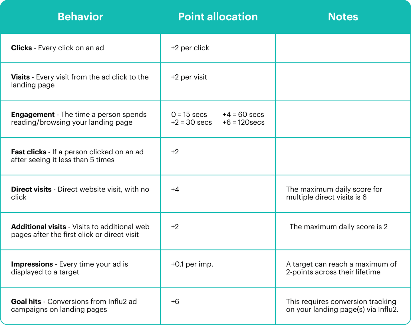 Influ2 tracks and scores the online behavior of every target within a campaign. The ad engagement data for one specific individual is classified as the Personal Behavioral (PB) Score. A high PB score reveals which targets were most interested in and engaged with your campaign. Here's how it's calculated:
