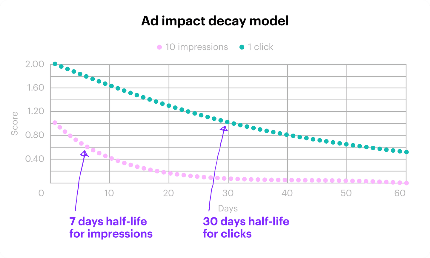The Personal Behavioral Score is adjusted for decay. The effect from ad impressions and clicks decreases over time (e.g., in 7 days an ad impression will be worth 0.05 points instead of 0.1, similarly in 30 days a click will be worth 1 point, instead of 2 points).