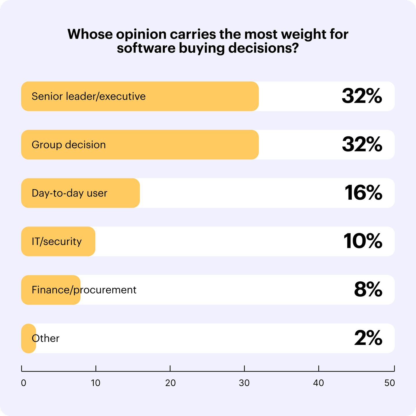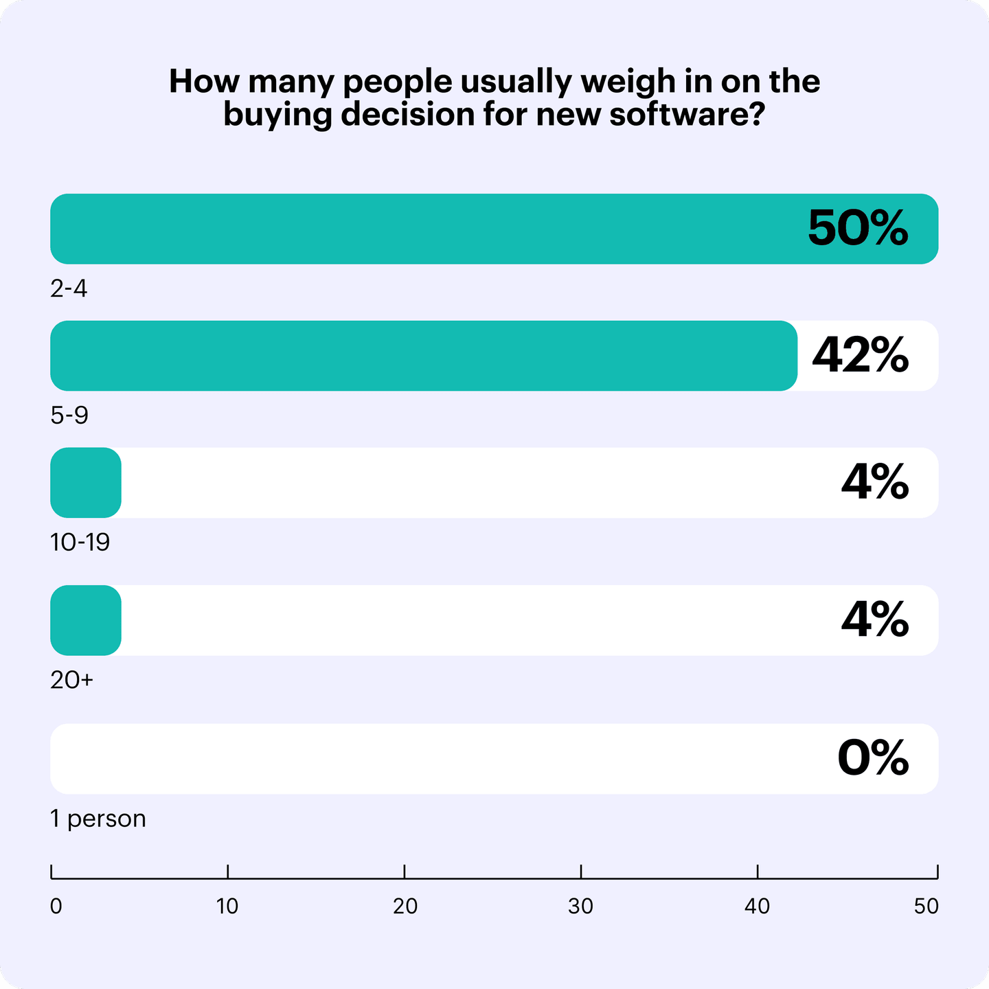 But the majority of buying groups were either 2-4 people (50%) or 5-9 people (42%). We also dug into whose opinion carries the most weight when teams decide on a vendor.