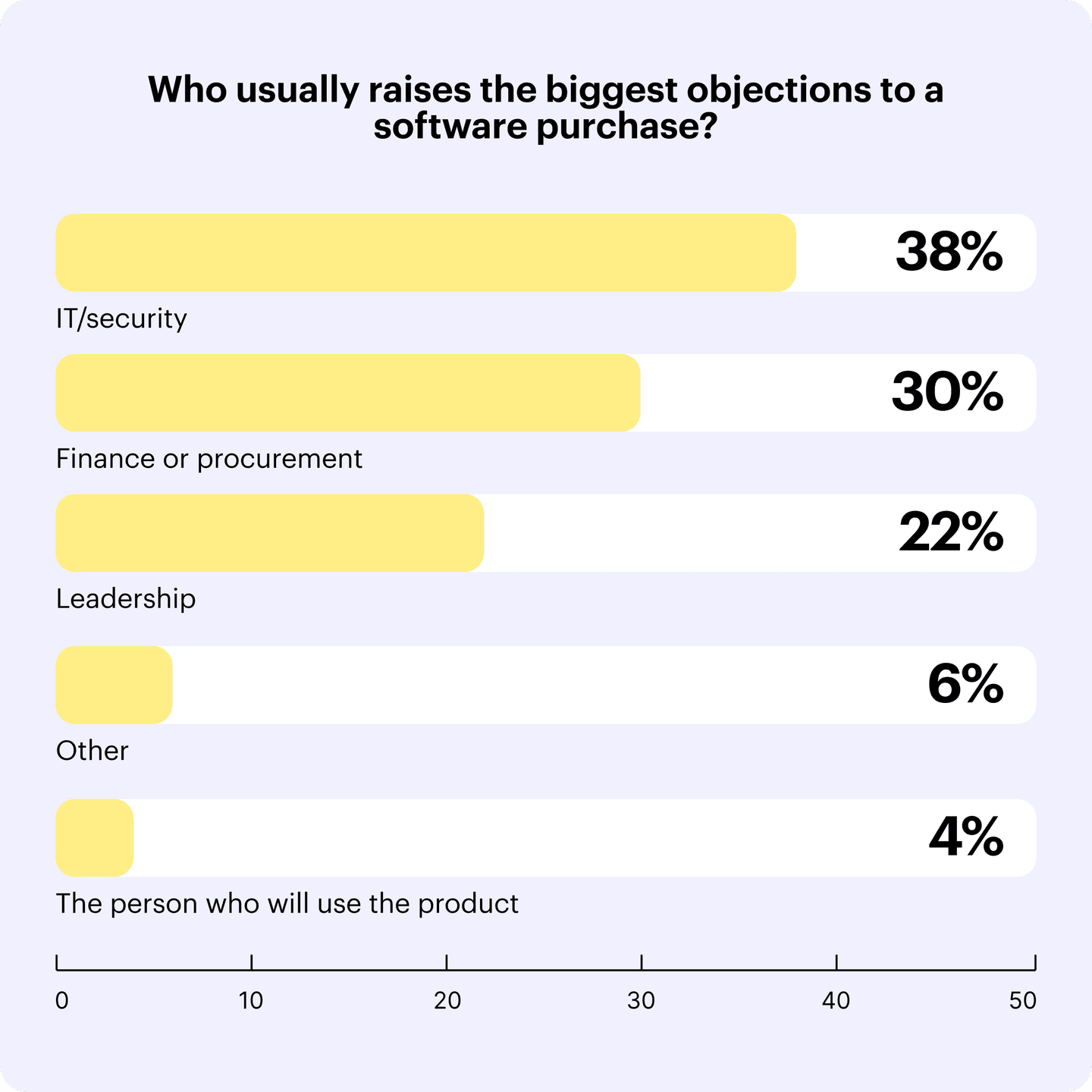 When we asked who raises the biggest objections in a purchase, IT and Security were top of the list at 38%, while Finance and Procurement came in second at 30%.