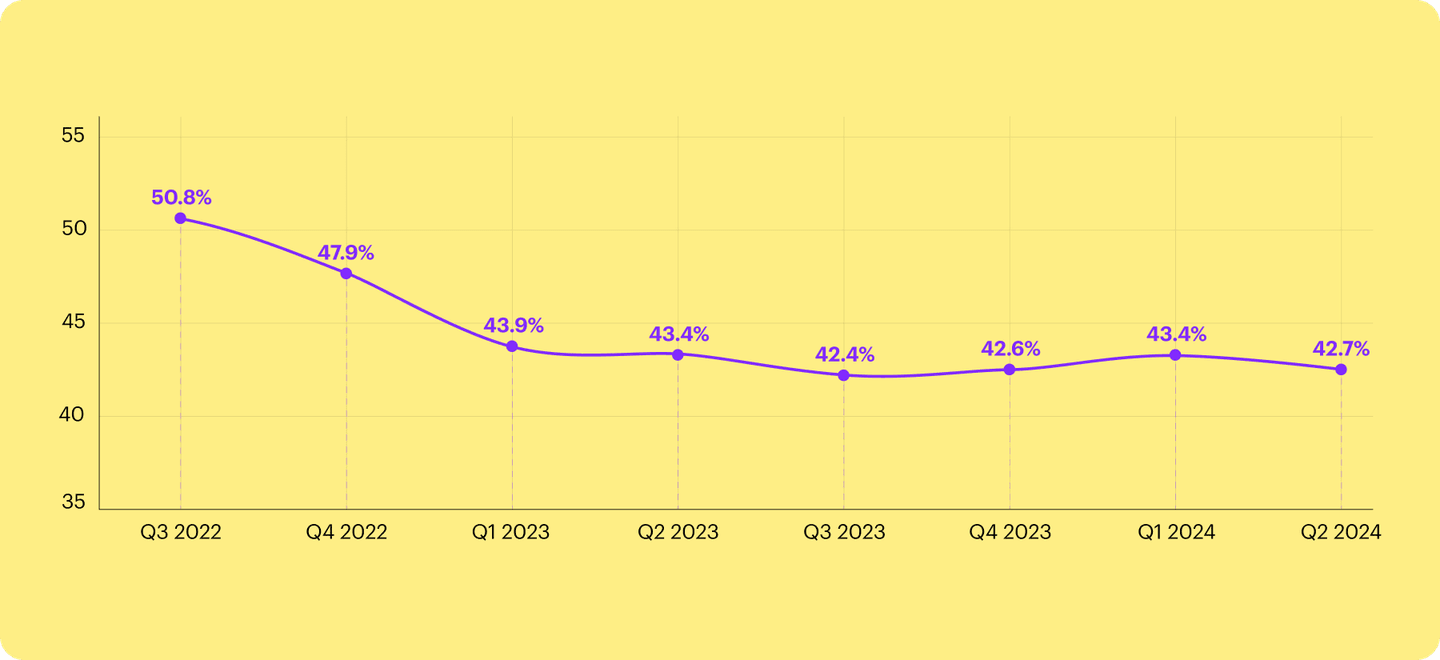 RepVue recently released a very telling report about the state of sales for SaaS companies. According to their data, the percentage of salespeople who hit their quota dropped from 53% in Q1 2022 to 42.7% in Q2 2024.