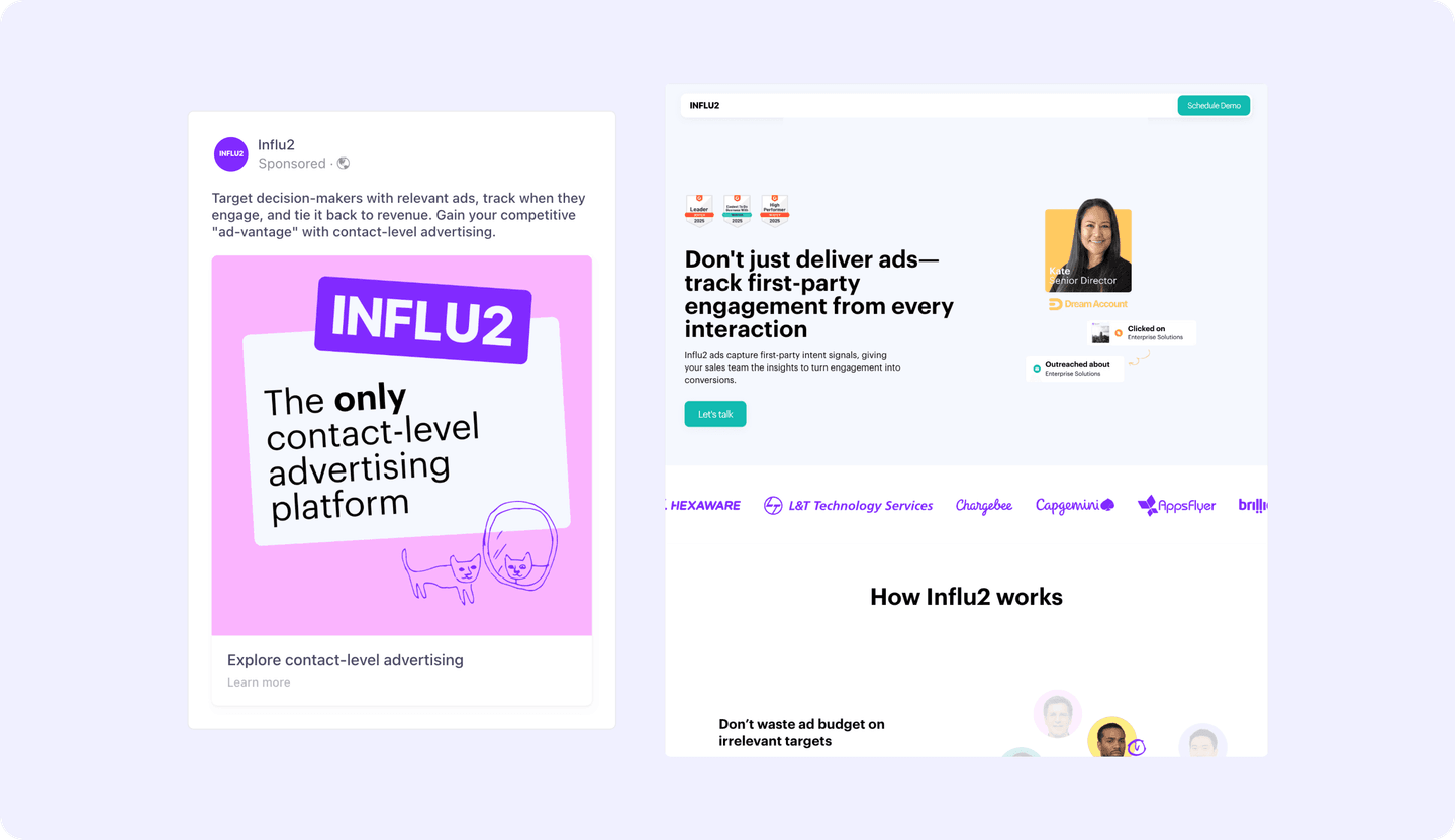 For instance, we recently held a webinar to launch our new Sales & Marketing Alignment Dashboard. As part of the promotion, we ran contact-level ads (with Influ2) targeting customers who’d benefit from the feature.